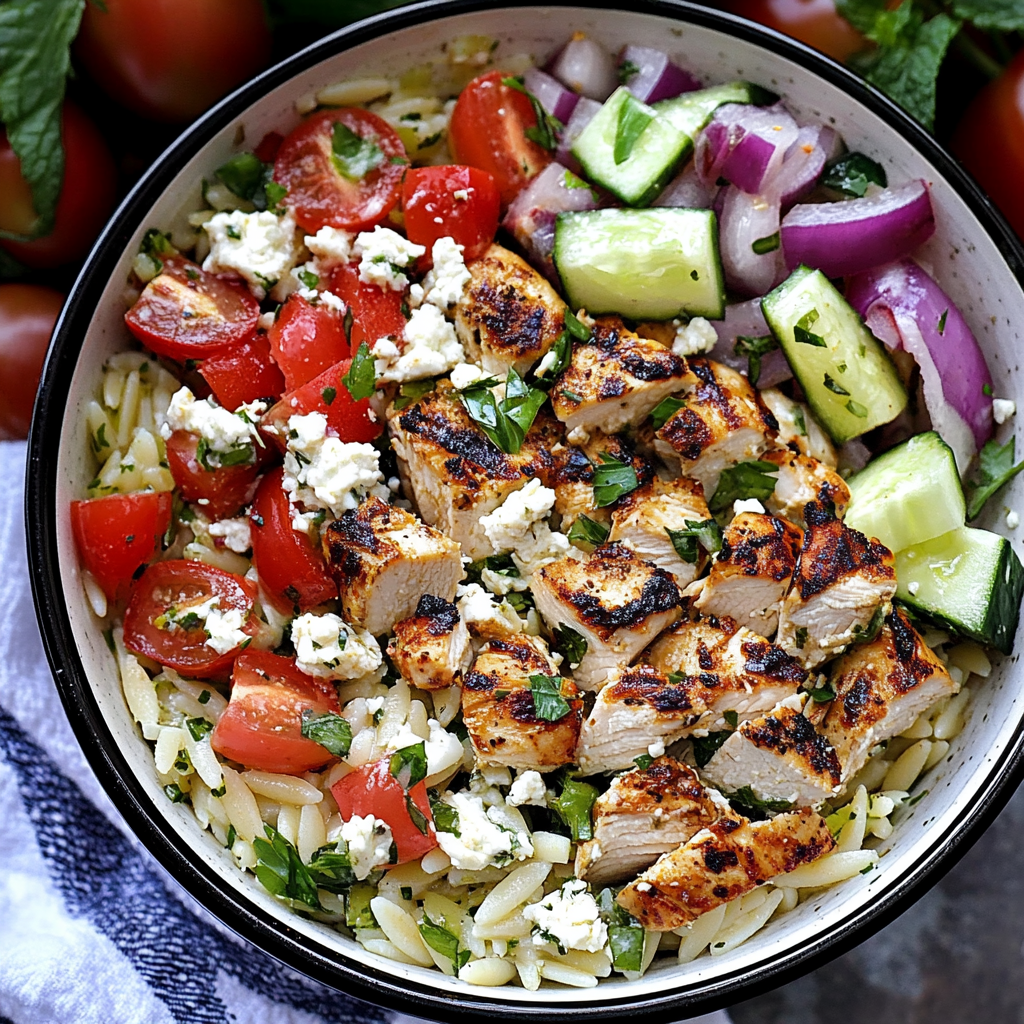 - Assemble: In bowls or plates, layer the cooked orzo as a base followed by grilled chicken slices and chopped veggies.